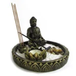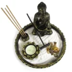 Acompanha uma imagem de buda, um porta vela, uma vela tealight, um incensário, três incensos, areia, vassourinha para harmonização e um kit de pedras.